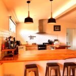 A back door leads out to a screened outdoor shower in a secluded part of the garden.